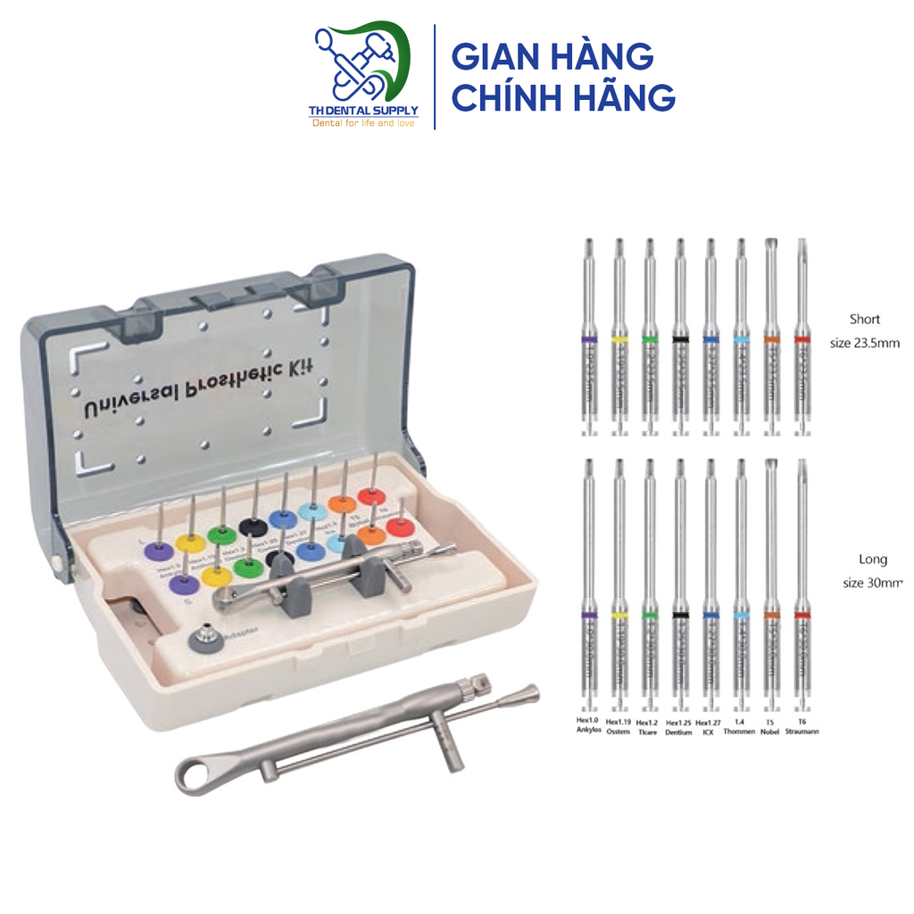 Bộ kit bao gồm 8 cán ngắn và 8 cán dài, cho phép xử lý nhiều trường hợp cấy ghép khác nhau. Sản phẩm phù hợp với đa dạng các hãng implant, mang lại sự tiện lợi khi không cần sử dụng nhiều bộ dụng cụ từ các thương hiệu riêng lẻ.